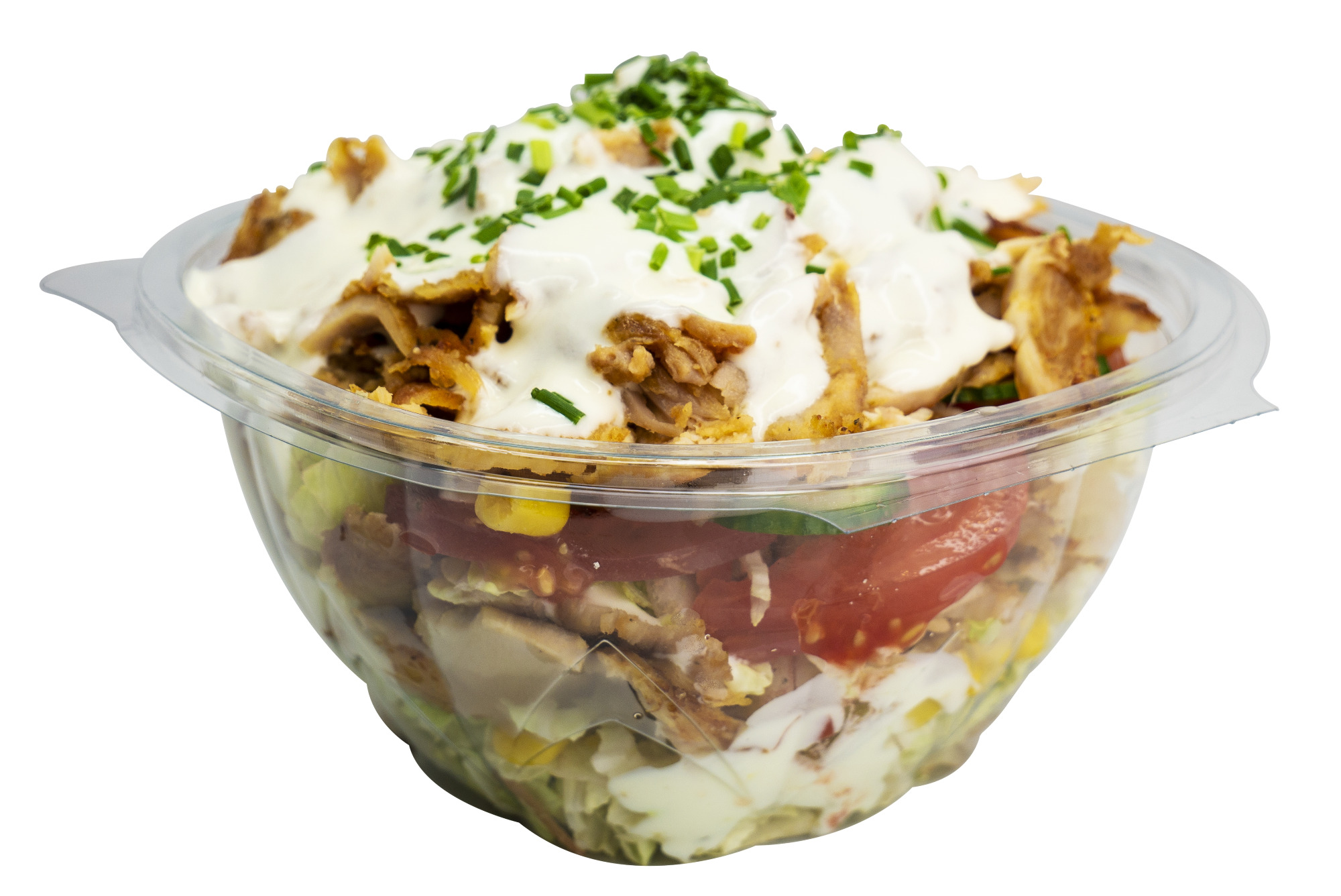 kurczak, pomidor, ogórek, sałata lodowa, kukurydza, sos